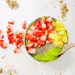 Strawberry, Kale, coconut milk, vegan protein powder, chia seeds, honey.